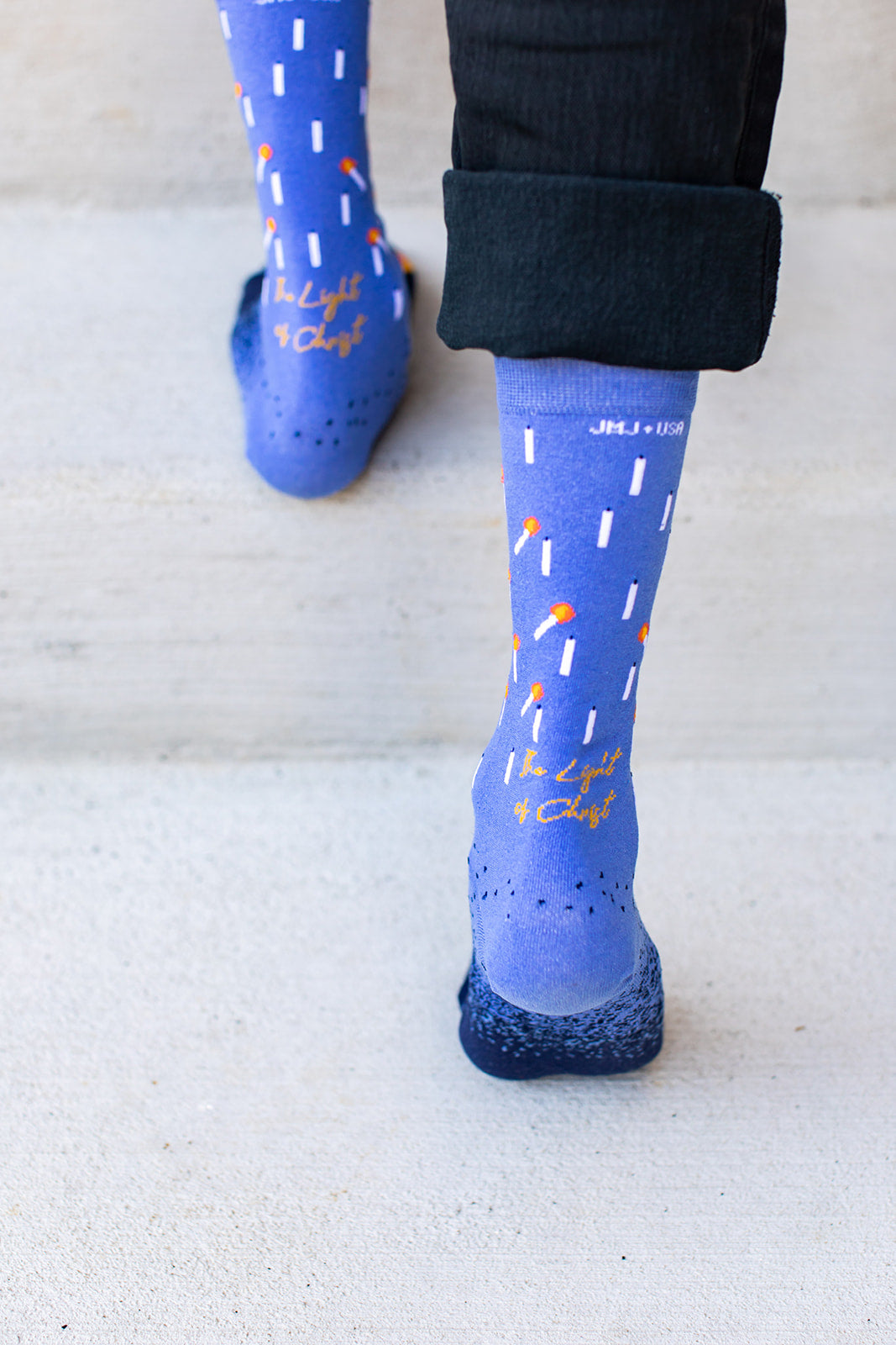 - Each sock’s essential stitches represent the Holy Family: Tan around the inside of the cuff, representing St. Joseph as head and protector of the Holy Family. Blue (outside) and white (inside) representing Mary and Jesus stitched across the toe of every sock.