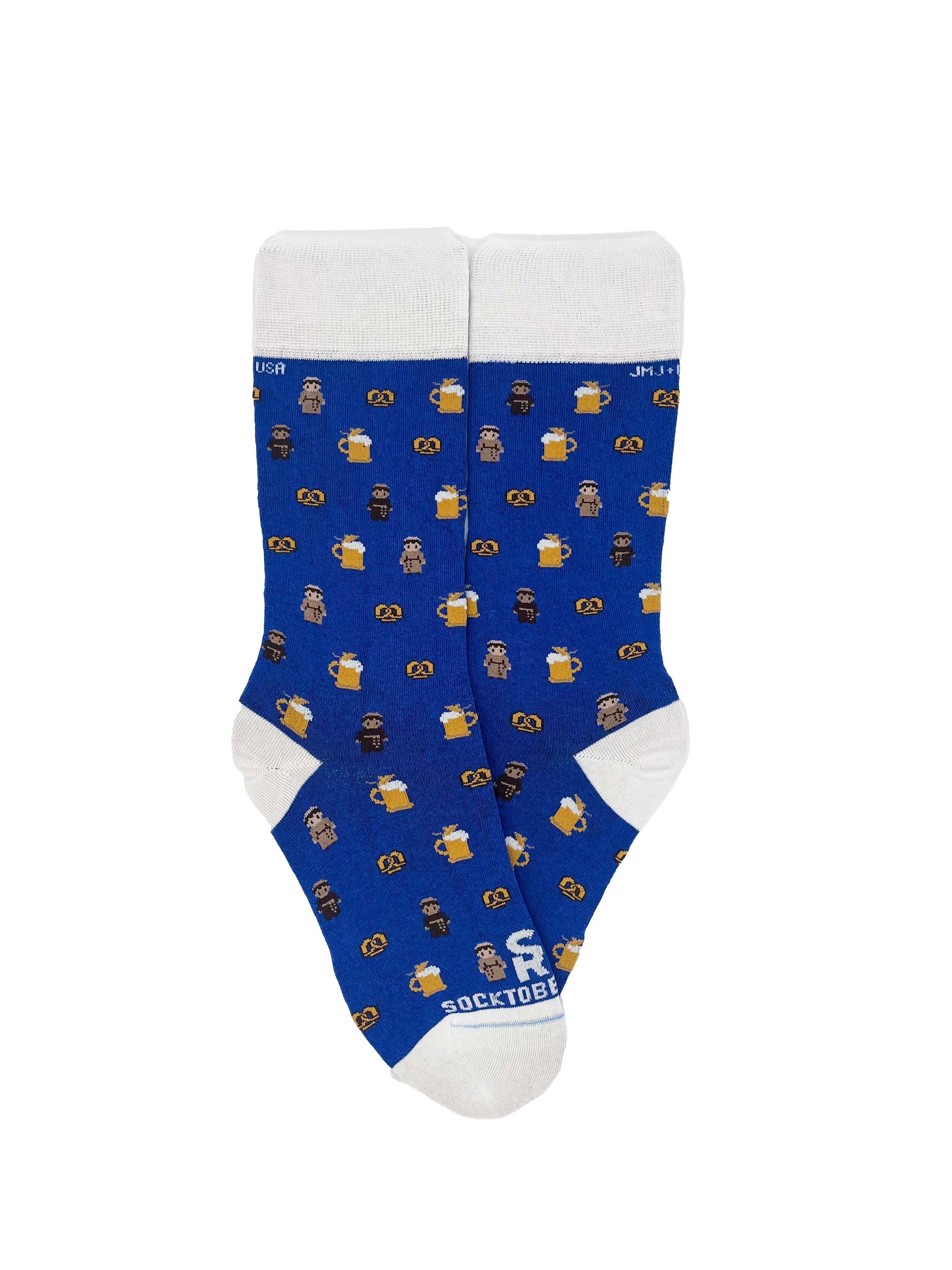 Oktoberfest, the world's largest beer festival, originated in Munich, Germany, in 1810 to celebrate the royal wedding of Crown Prince Ludwig and Princess Therese of Saxony-Hildburghausen. It has since evolved into an annual celebration of Bavarian culture and beer. Our Socktoberfest sock is a tribute to tradition and craftsmanship, drawing inspiration from the rich history of Franciscan monks who meticulously brewed the iconic Oktoberfest beer in 16th-century Bavaria. The pattern adorning the sock features our beloved Franciscan monks, traditional German beer steins (long symbols of German beer culture), and pretzels, a quintessential Oktoberfest snack. The blue and white color scheme evokes the traditional colors of the festival, representing the Bavarian skies and clouds. With each step, embrace the legacy of the monks, the artistry of beer stein craftsmen, the joy of pretzels, and the vibrant spirit of Oktoberfest. Prost to tradition and celebration!