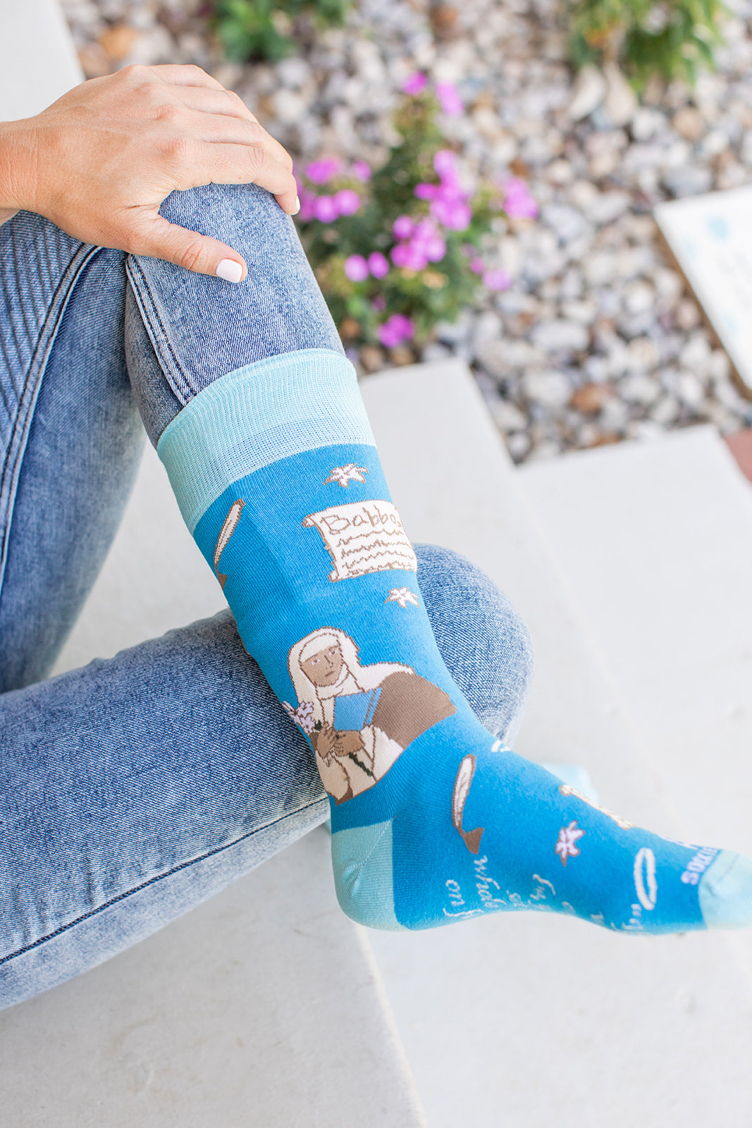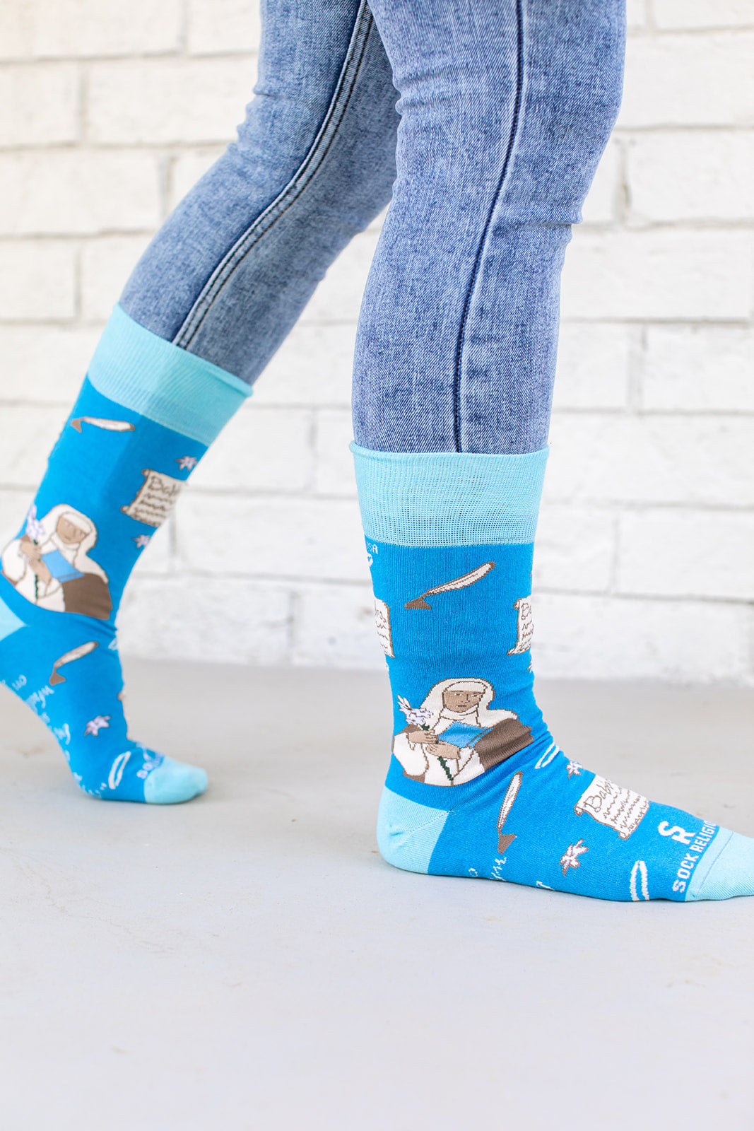 Wear these socks and remember one of St. Catherine of Siena's most well-known quotes (on the bottom of this sock) - "If you are what you ought to be, you will set the whole world on fire."