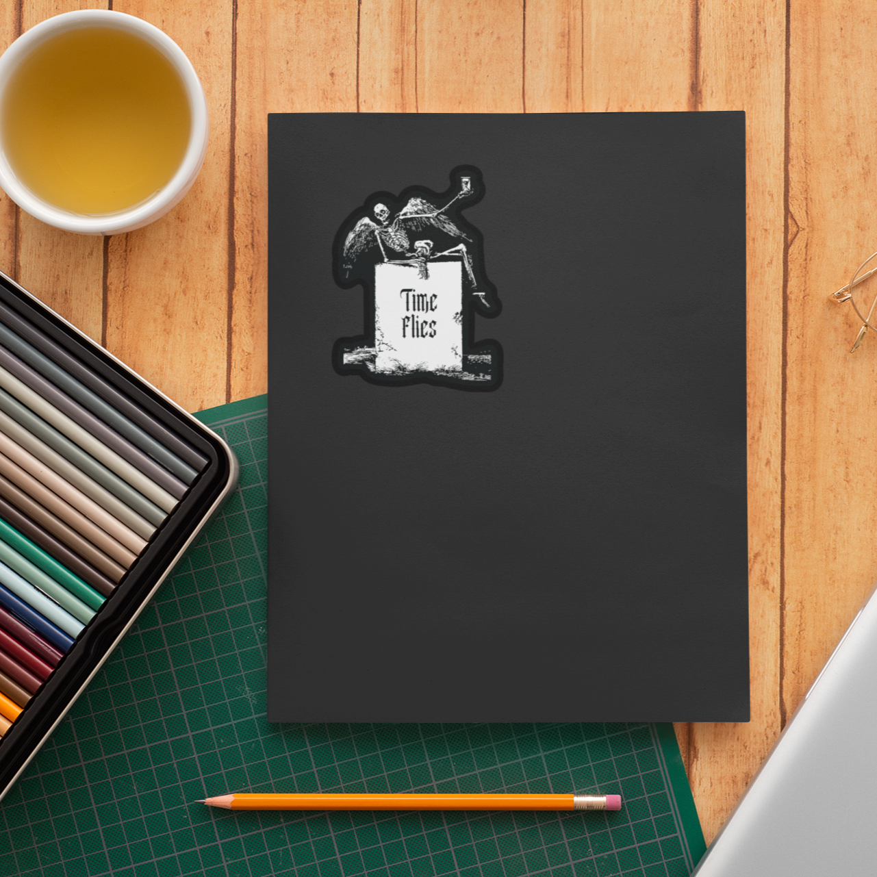 The Time Flies - Memento Mori Sticker is a cheeky, gothic reminder that every hourglass eventually runs out. Featuring a winged skeleton (yes, he flies), an hourglass, and a classic tombstone engraved with “time flies,” this design brings serious “live for Heaven” energy. With bold black-and-white contrast and a healthy dose of holy memento mori flair, it’s the perfect decal for your water bottle, laptop, notebook, or anywhere that could use a reminder of your mortality—and your mission.