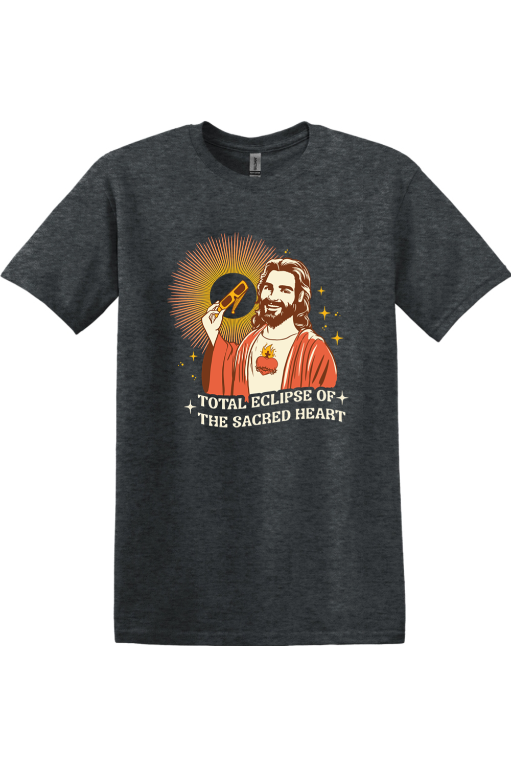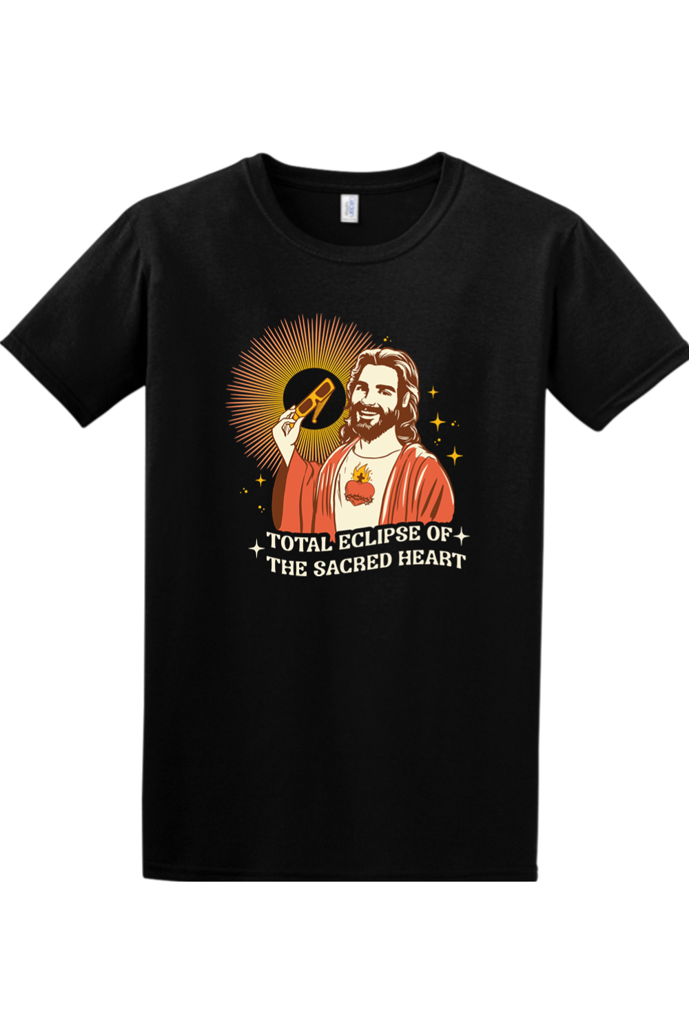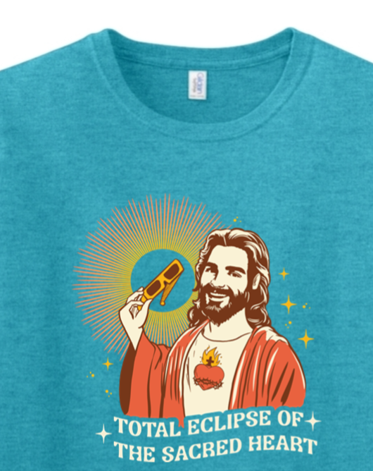 April 8, 2024 in the USA is a big day! (for a very specific geographic path) It's a Total Solar Eclipse! Mark this iconic event with an even more iconic T Shirt. THE SON himself, holding Solar Eclipse glasses. There's no better shirt to wear for this special day in history "Total Eclipse of the Sacred Heart T Shirt!"