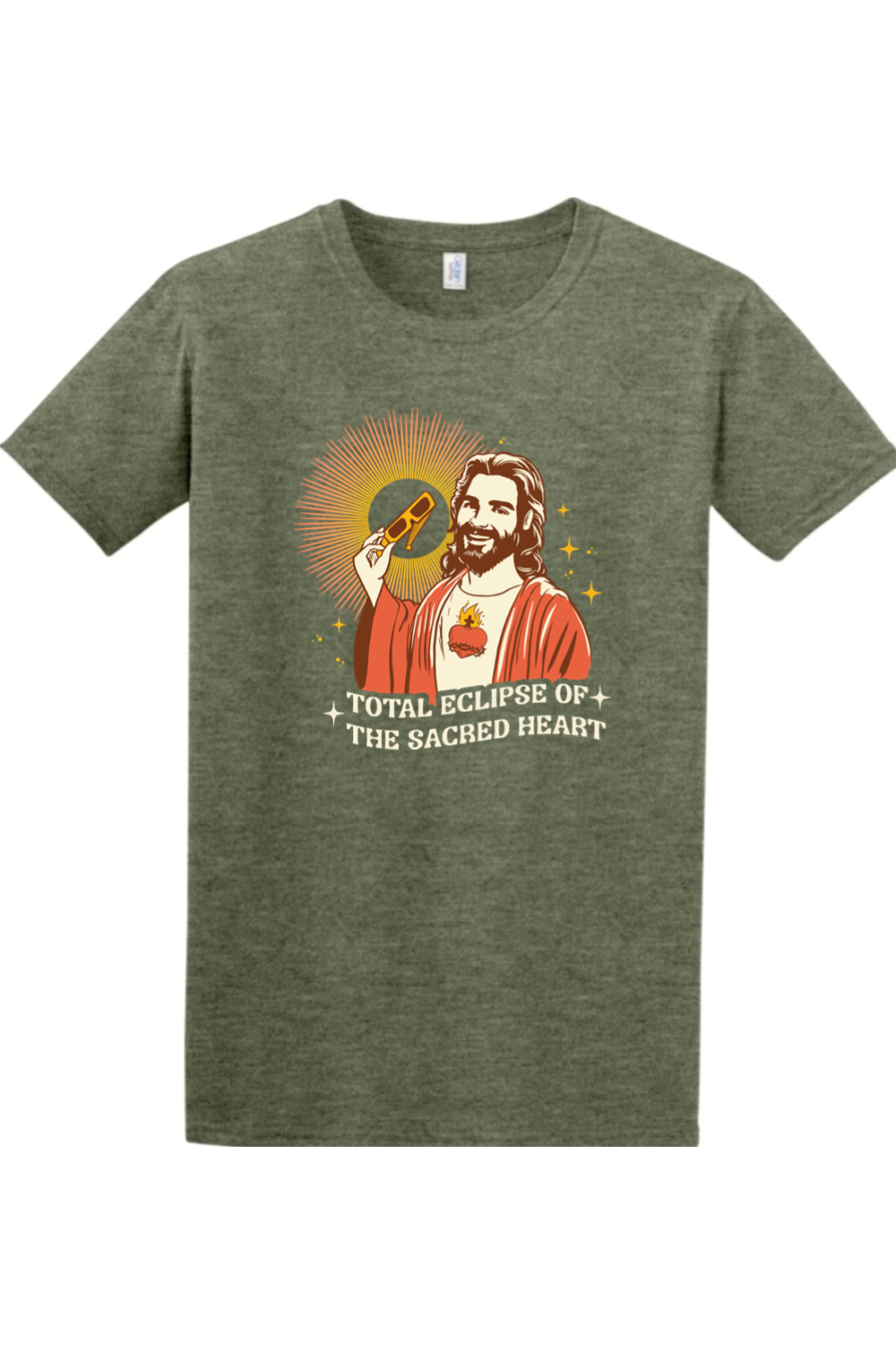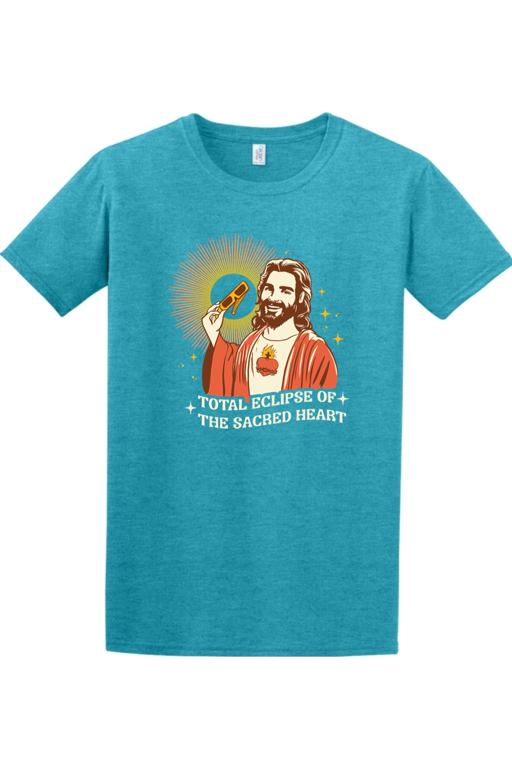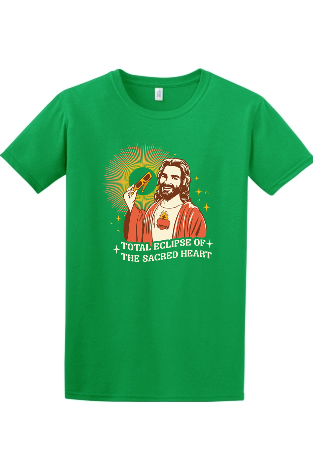 April 8, 2024 in the USA is a big day! (for a very specific geographic path) It's a Total Solar Eclipse! Mark this iconic event with an even more iconic T Shirt. THE SON himself, holding Solar Eclipse glasses. There's no better shirt to wear for this special day in history "Total Eclipse of the Sacred Heart T Shirt!"